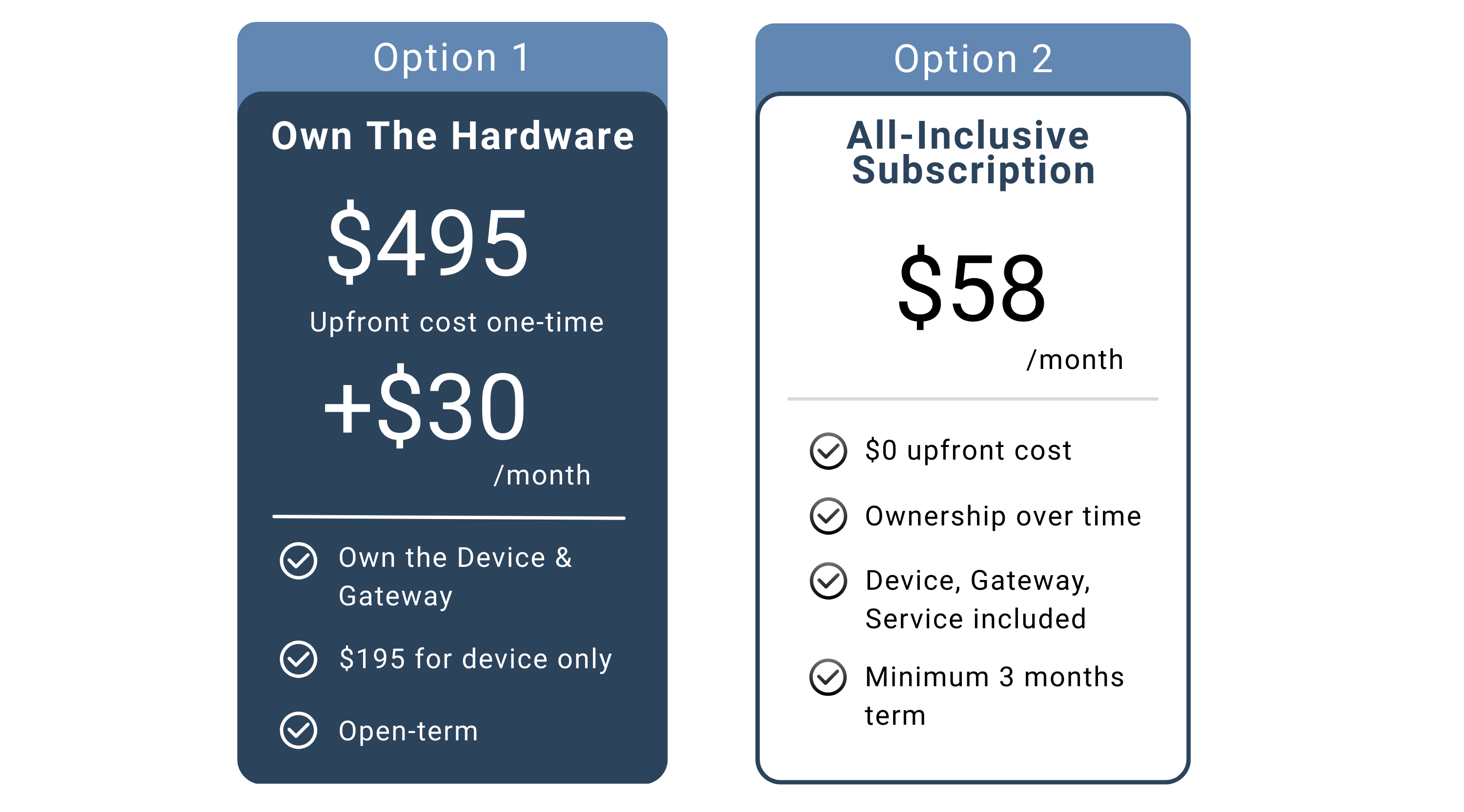 Option 1 - Own the Hardware: You pay upfront for the device, gateway, and initial harness then a lower monthly subscription for service.